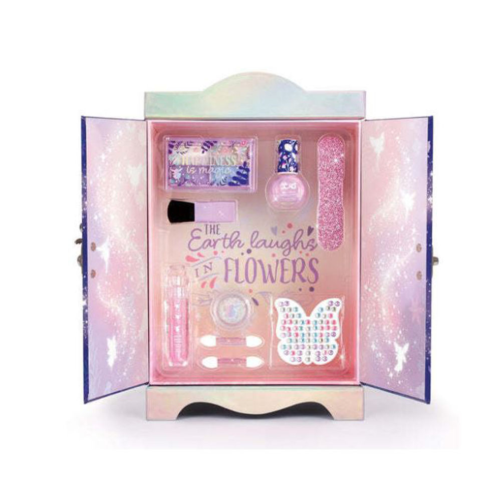 Description: Tweens will feel like fairies as they experiment with different makeup looks! Using the included eyeshadow palette, strawberry-scented lip gloss, nail file, nail polish, nail gems, and body shimmer, tweens will have the freedom to express their unique sty